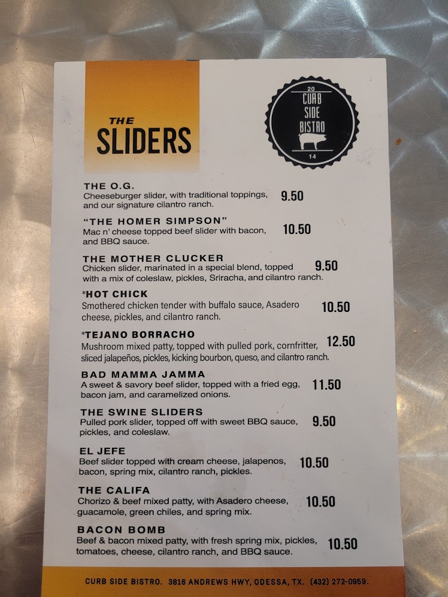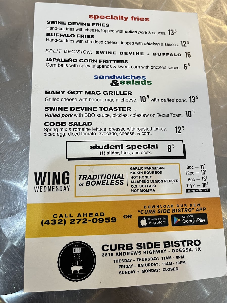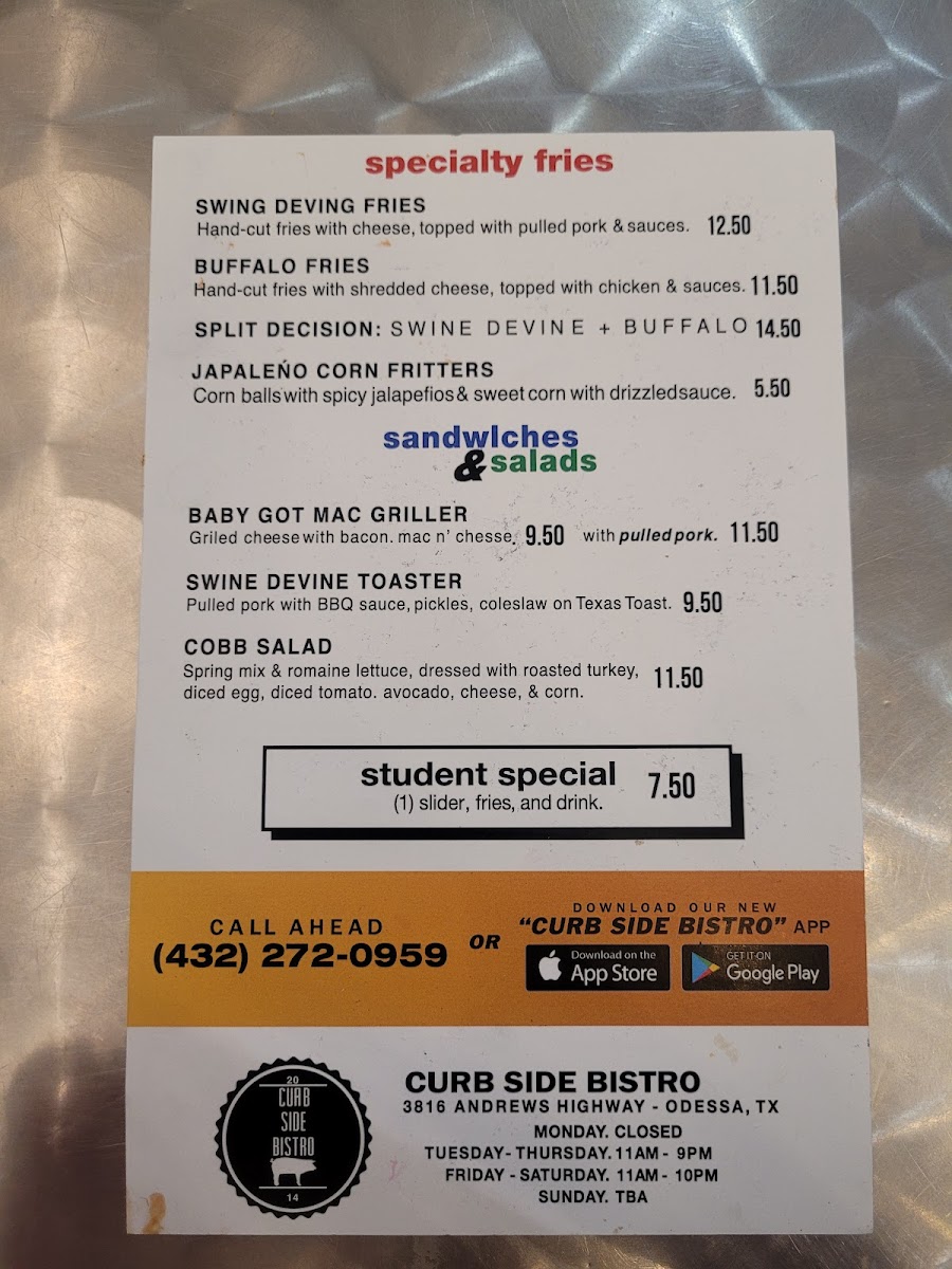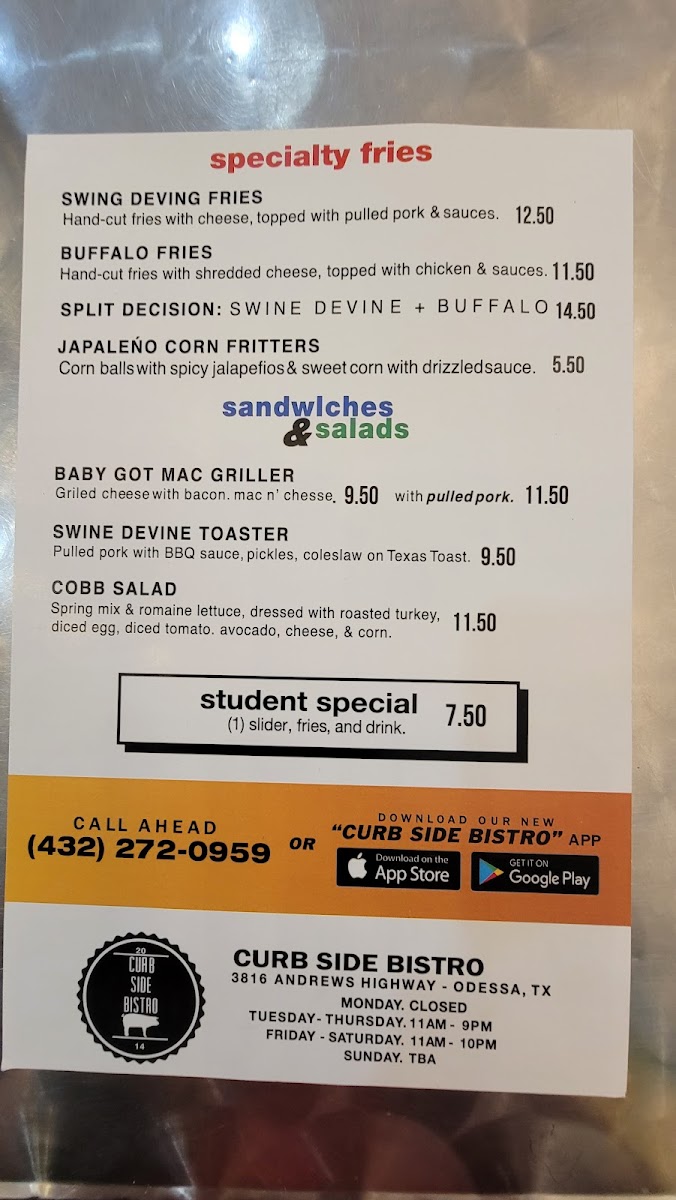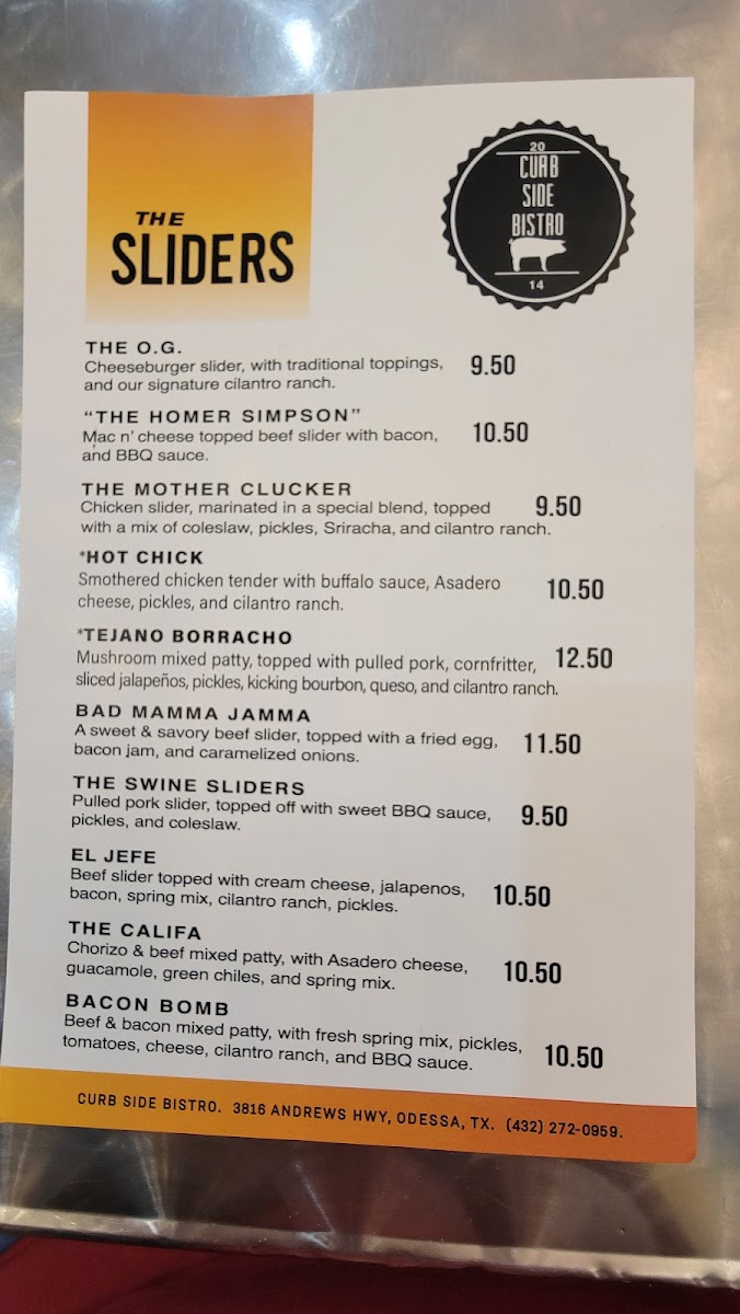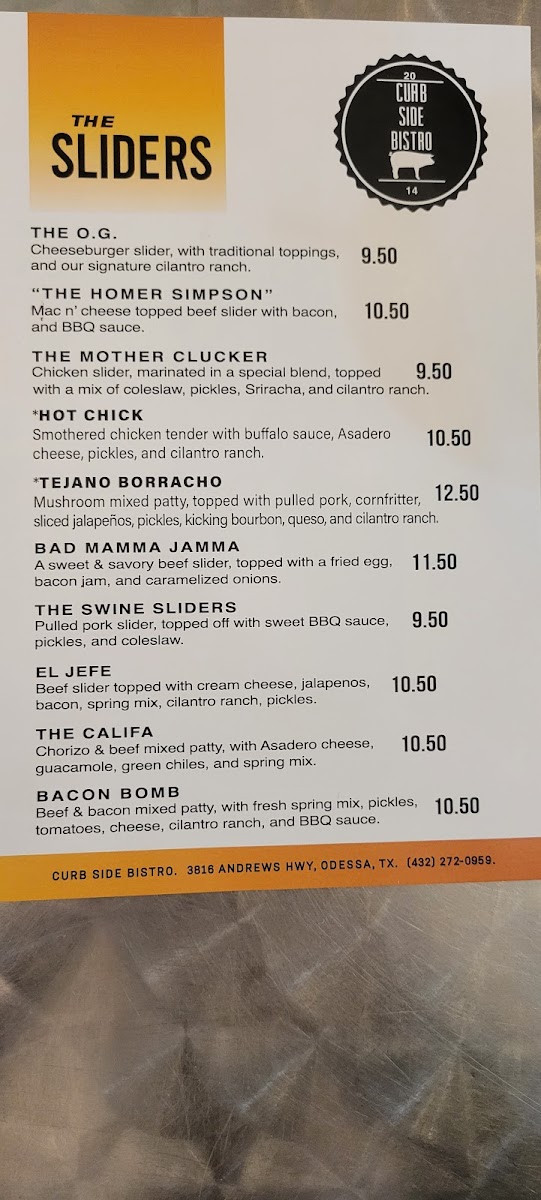 At Curb Side Bistro Menu, you'll find a vibrant mix of flavors that make every bite something to look forward to. Whether you're stopping by for a quick lunch or settling in for a relaxing dinner, the menu offers a wide variety of dishes to suit every craving. Located at 3816 Andrews Hwy in Odessa, TX, this spot is perfect for those who love fresh ingredients and bold flavors. From savory starters to mouthwatering mains, each dish is crafted with care to satisfy your taste buds.