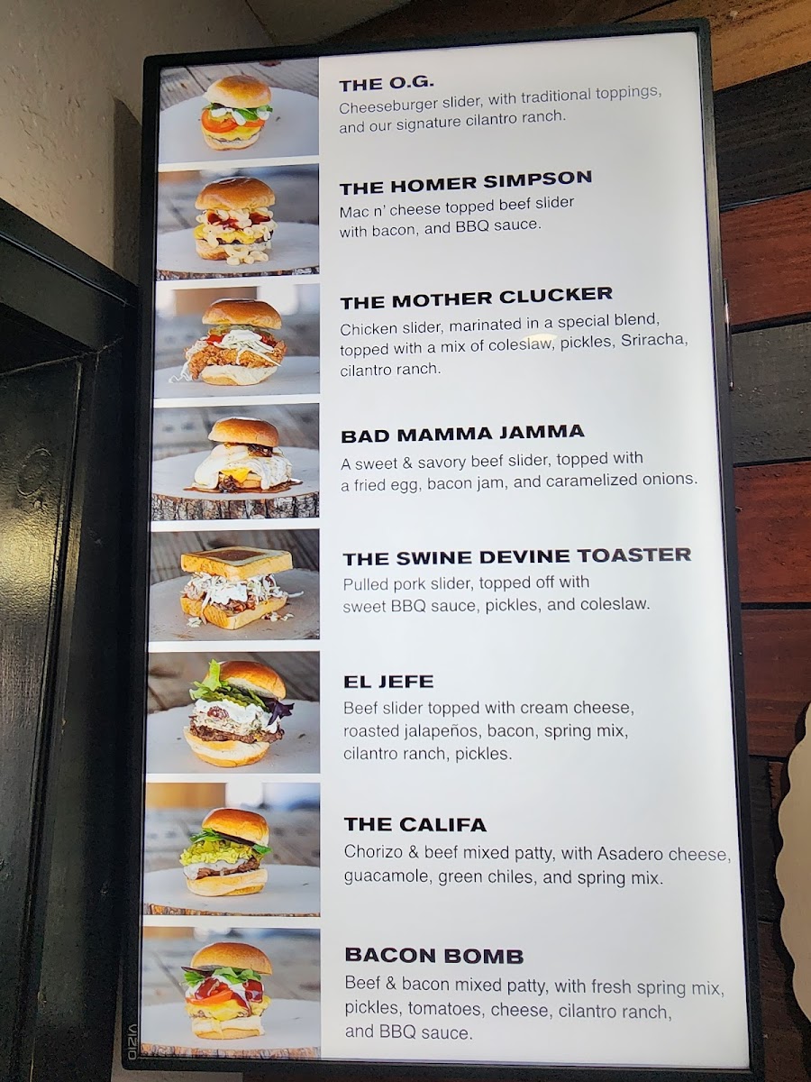 A mixture cream cheese, roasted jalapeños and bacon on top of a juicy beef patty dressed with our delicious signature cilantro ranch, pickles and baby greens. 2 slides to an order with a side of our amazingly delicious hand cut fries and our dipping sauces.